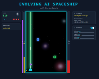 Evolving AI Pilot: The central feature is the AI that controls your ship. It operates on a profile of traits like Defense, Offense, and Utility. After each game, the AI evaluates its performance. If it improved, it keeps its new, mutated strategy; if not, it reverts to its last successful profile, creating a simple evolutionary learning loop. You can also manually override and tune the AI's parameters in real-time to test your own strategies.